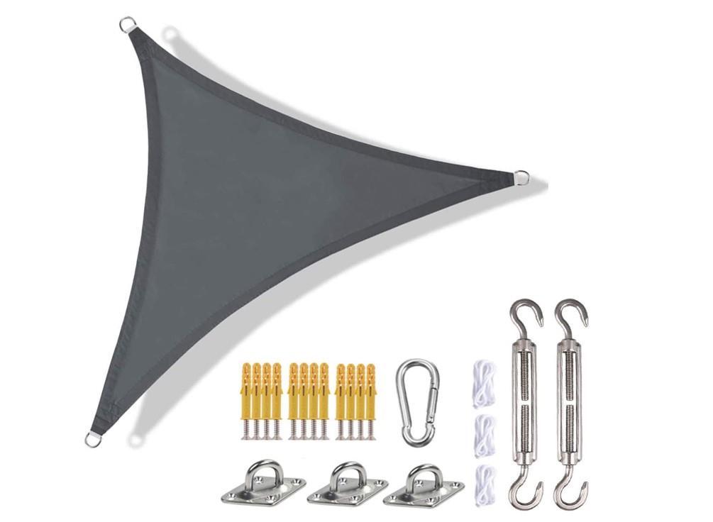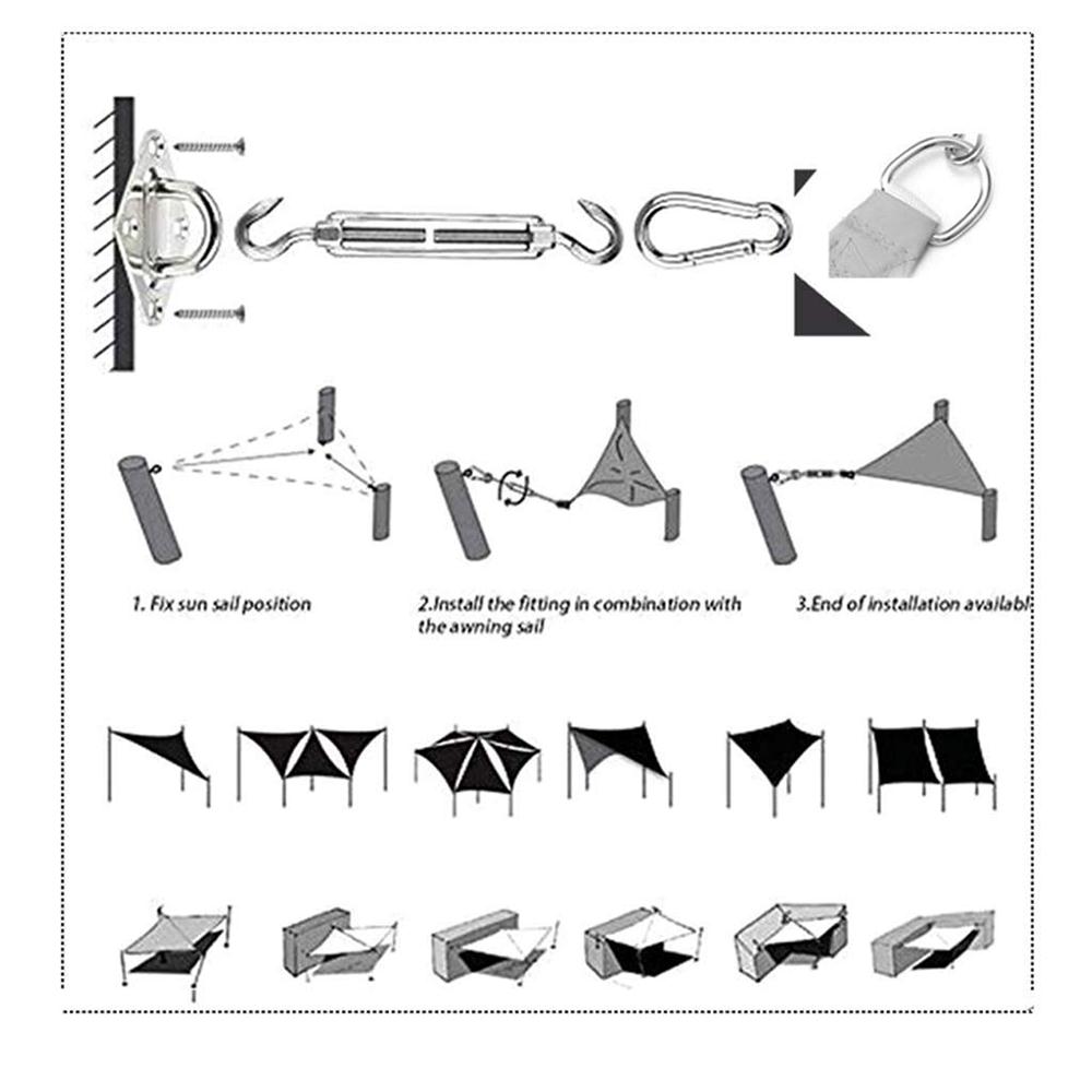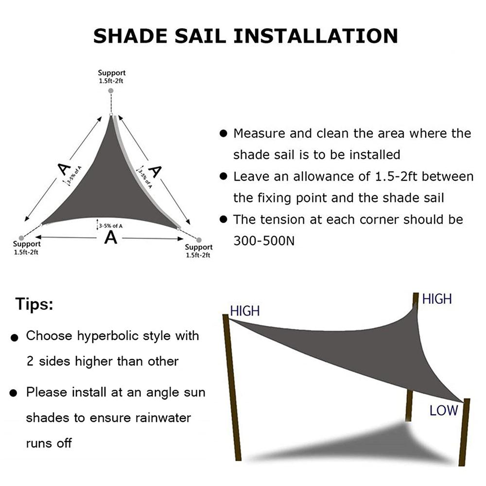 ♦PLACE OF USE --- Awning awning offers you a cool summer, ideal for terraces, lawns, gardens, swimming pools, ponds, terraces, gardens, courtyards, parks, lawn, parking area, sand pits and other outdoor activities. Its effectively reducing the heat in your outdoor spaces. Perfect sun shade sail for your car, restaurant, garden, beach, terraces, swimming pools, barbecues, etc.♦COMPLETE ACCESSORIES AND PERFECT SIZE --- Sun shade sail size is 3*3*3m, Ropes x 3pcs, Snap hook x 2pcs, Turnbuckle x 2pcs, Pad eye x 4pcs, Screws x 16pcs, Plastic expansion x 16pcs, To help you fix the sunshade in bad weather.