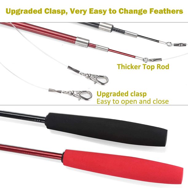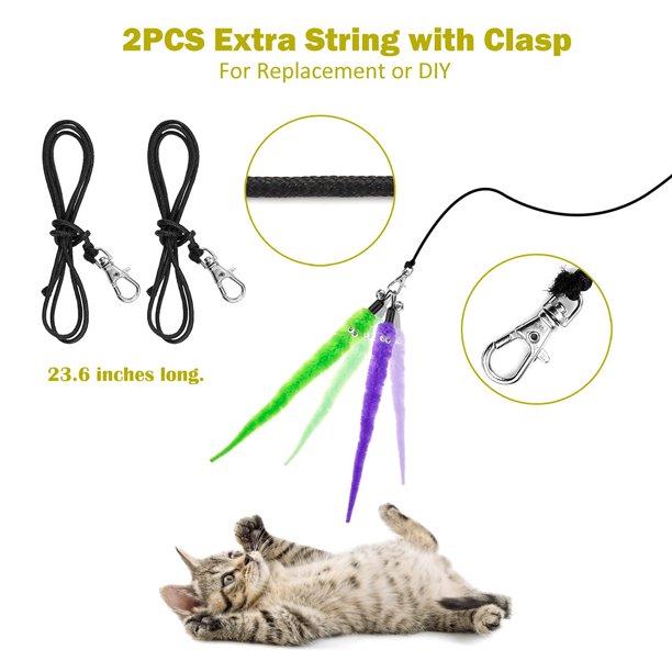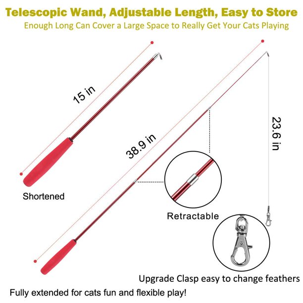 2. CLASSIC PRACTICAL INTERACTIVE CAT TOY: This interactive cat toy wand will help your Indoor cats to flip, jump, pounce, chase. Great way to get your cats energy out and do more exercise, making your cat be released and happy! Suitable for kittens and cats of all ages and sizes! A great toy to spend some quality time with your feline friend! Enjoy the happiness time with our toy! This is a CLASSIC cat toys for indoor cats, give your fur baby a try! 3. TELESCOPIC FISHING POLE DESIGN: This cat toys wand extends from 15 in to 38.9. It's very light, flexible, durable and easy to store. The fully extend cat wand is long enough( 38.9 in) plus the string (23.6in) which can cover a large space for playing, it can really get your cats exercise. And it's very light so that cat-teasing is no longer a tough job for you. You can even sit on the couch watching TV while teasing cats with this cat kitten toys. 4. HIGH QUALITY AND SAFETY: The feathers made from Safe, natural material. The telescopic cat wand made of the new material with higher elasticity and hardness. Our clasp is easy to open and close for changing feathers. Package includes: 2Pcs Cat Wand + 9Pcs Feather Worms Refills + 2Pcs Extra Strings with Clasp. This cat toys can be used for longer periods of time. It’s good cat gifts! 5. CONSIDERATIONS: The foam handle of the wand is originally designed for pet owner using it more comfortable, it has the advantages of being lightweight, comfortable to hold, and won't blister your hands. As this is an interactive cat toy, we kindly supervise your cat all the time when playing this toy, in case they bite the string and handle. Keep it in a safe place pets can’t reach. Never leave your cat alone with this toy, because cats like to chew things like string and soft things.